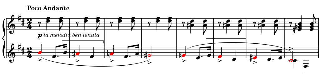 The A section introduces the main thematic material, characterized by a poignant melody, featuring the so-called ‘Grieg motif’ (think opening of the Piano Concerto, bracketed in ex. 1), which outlines a descending chromatic line (marked in red in ex. 1), B-A♯-A𝄮-G♯. Note how the outline of the second phrase, G𝄮-F-♯-E♯-C♯, also features the ‘Grieg motif’ in its final three notes. This lyrical line is central to the work’s expressive character, requiring a cantabile touch to allow it to sing. The syncopated accompaniment, which fills out the triadic harmony, remains above the melody both at the outset and when the first phrase-pair is repeated, in octaves, an octave lower. Bars 5-8 see a shift (enharmonically reinterpreting the leading-note, A♯=B𝄬) to the submediant minor. Although bar 8 sees the B𝄬/A♯ resolve to B(𝄮), the tonic note, this pitch forms part of a piquant dominant-11th chord, creating a sort-of imperfect cadence at the end of the phrase. When this phrase-pair is repeated, this cadence is not altered—as would often be the case—to conclude the paragraph with a perfect cadence. The tonal resolution and sense of closure that a perfect cadence would bring, is thereby denied.